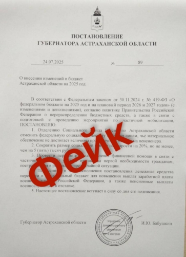 Оговоримся сразу: фото якобы постановления главы региона не имеет никакого отношения к подлинным документам, подписанным Игорем Бабушкиным. Фейк содержит информацию о том, что в связи с подготовкой к частичной мобилизации надо провести перераспределение бюджетных средств путем сокращения размера социальной пенсии по старости на 20%, а также отмены финансовой помощи тем, кто пострадал в результате чрезвычайных ситуаций.
