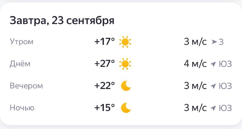Если верить прогнозам синоптиков, во вторник, 23 сентября, ожидается ясный день без осадков. температура воздуха составит 27 градусов. Ветер юго-западный, 4 м/с.
