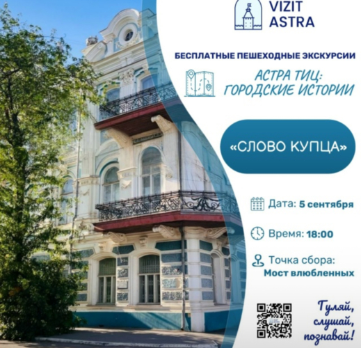 5 сентября, в пятницу, состоится бесплатная пешеходная экскурсия «Слово купца». Во время прогулки все желающие смогут пройтись по старинным улицам города, познакомиться с архитектурными шедеврами Купеческой Астрахани и судьбами их владельцев.