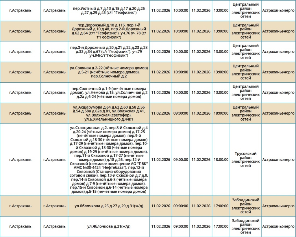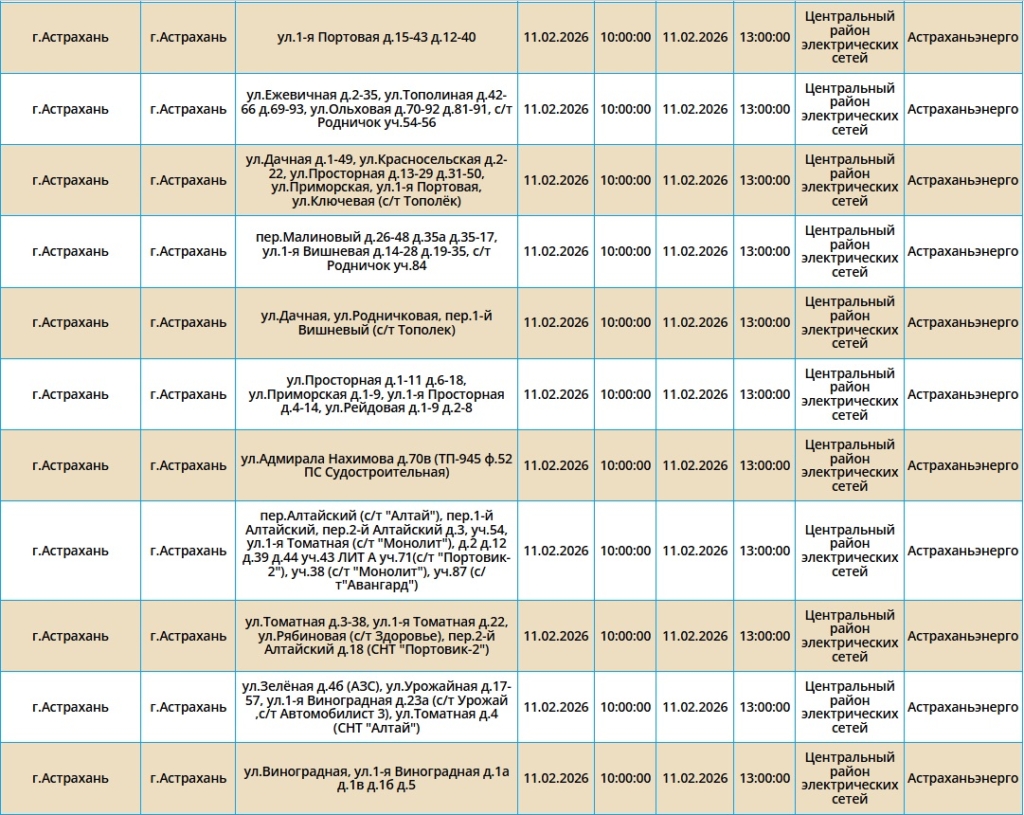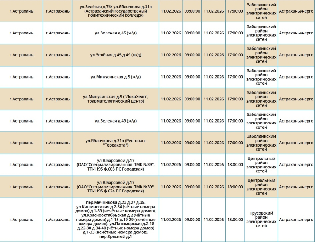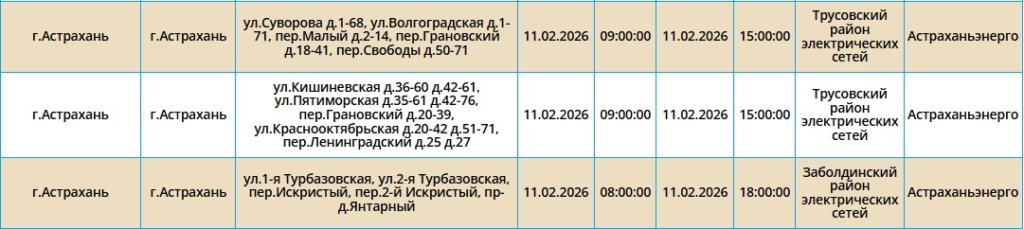 Неудобства затронут жителей Астрахани, а также двух населенных пунктов области. В течение нескольких часов без электроснабжения останутся сотни жилых домов, один из ресторанов и здание управления Россельхознадзора. Самые ранние отключения начнутся в 08:00 и в отдельных районах могут продлиться до десяти часов. Полный перечень адресов, попадающих под ограничения, опубликован ниже: