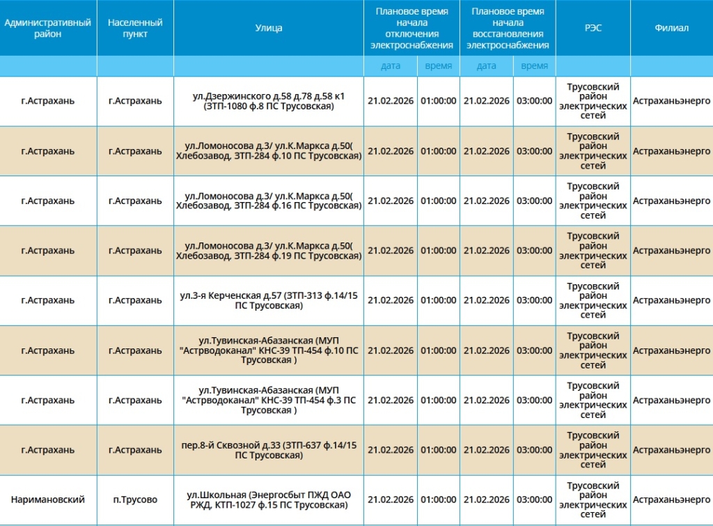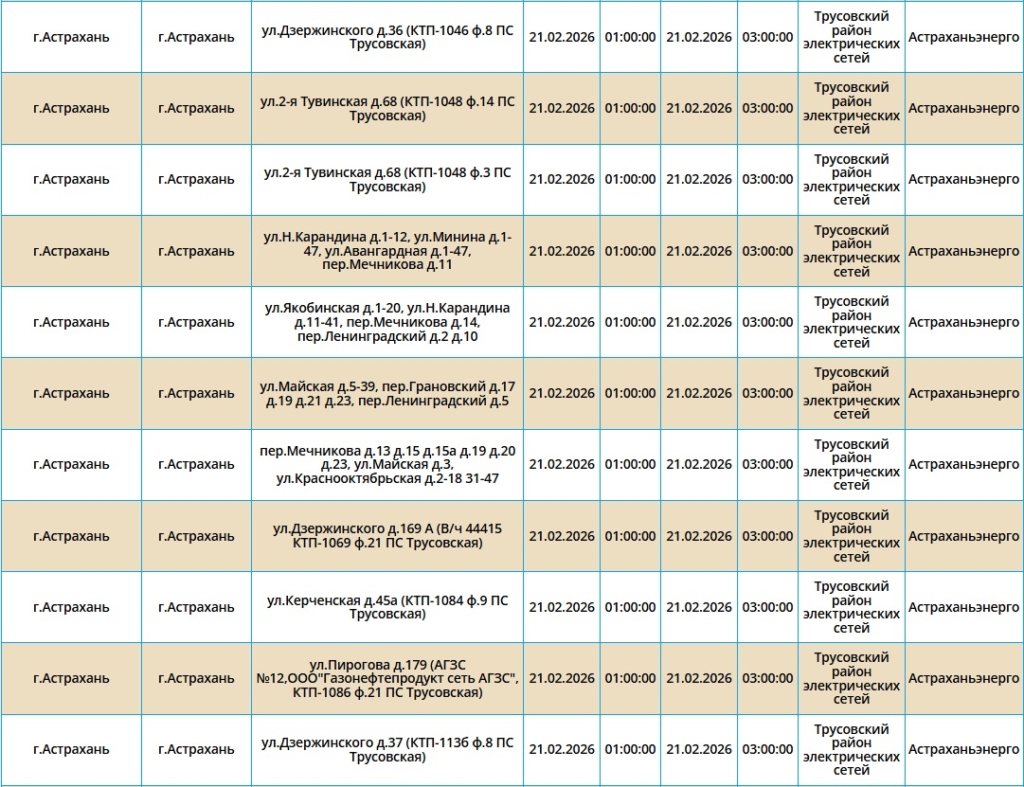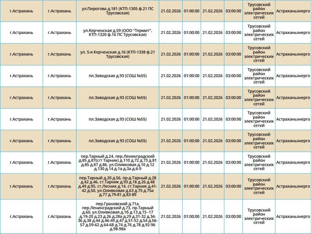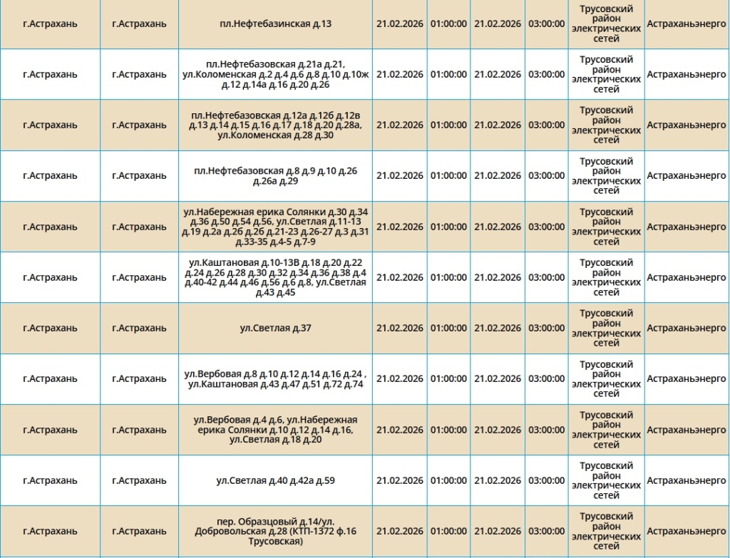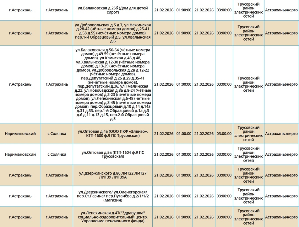 Электроэнергию отключат как жителям города Астрахань, так и Наримановского района. Самые ранние отключения начнутся уже ночью, в 01:00. В это время сотрудники ПАО «Россети Юг» будут проводить плановые ремонтные работы на электросетях. Некоторые отключения мы опубликовали в галерее ниже, полный список адресов смотрите по этой ссылке.
