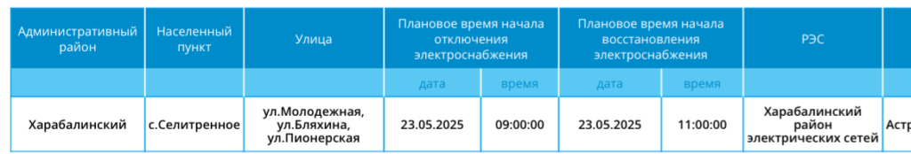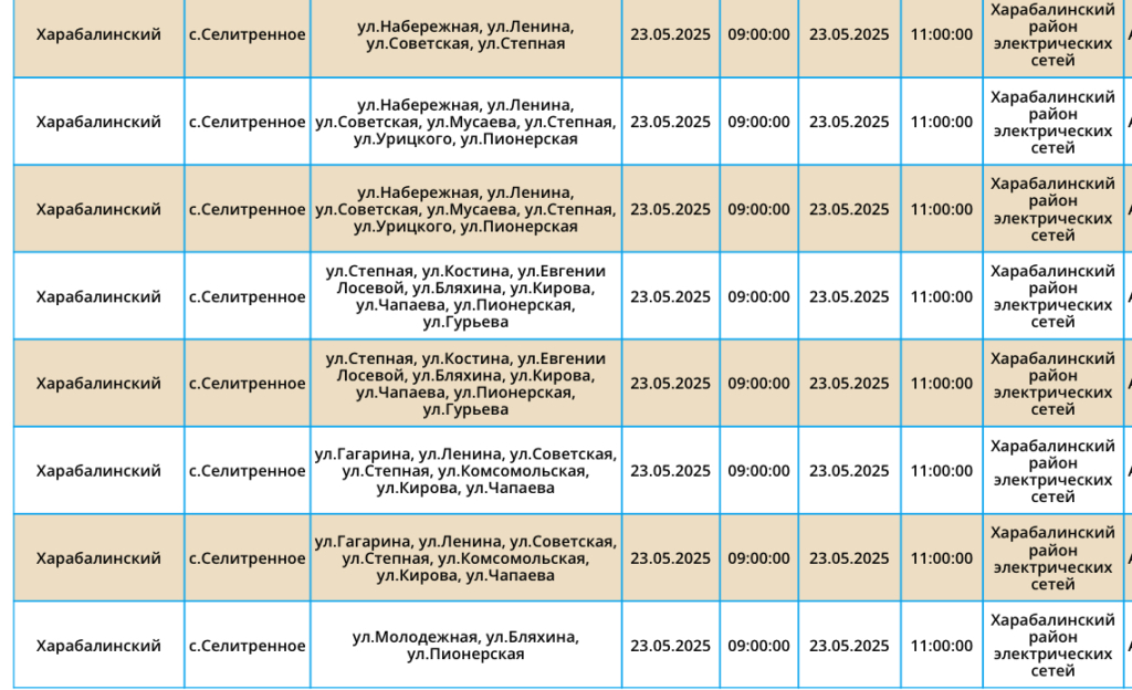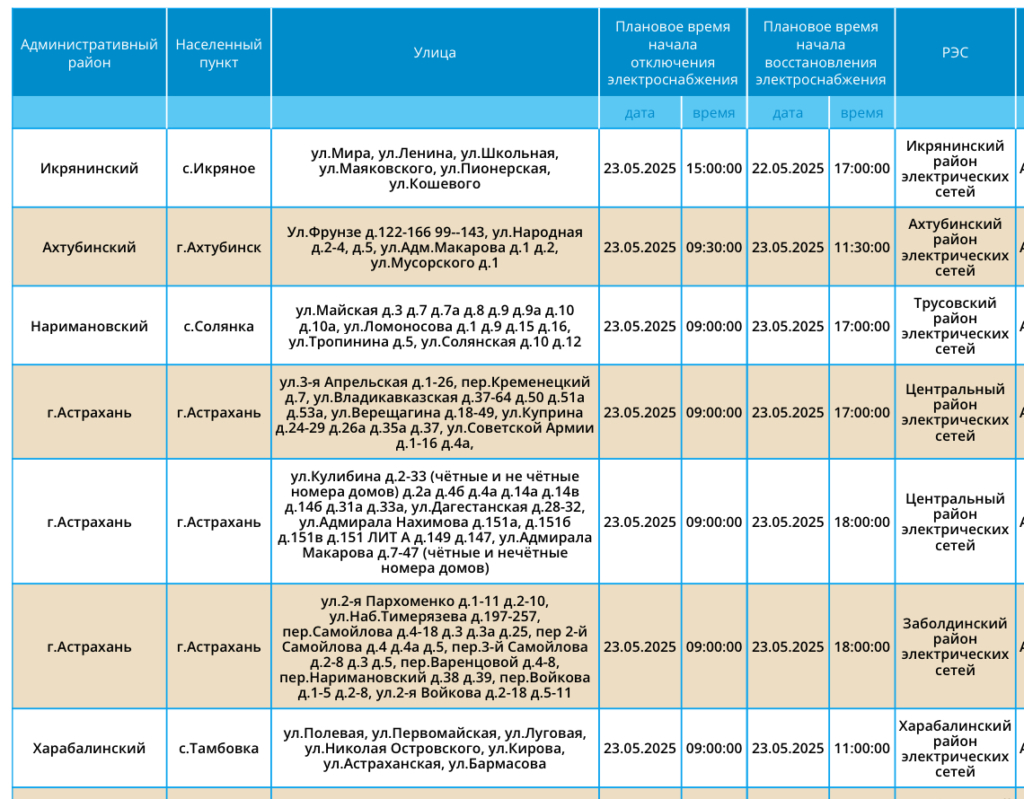 Света не будет в Икрянинском, Харабалинском, Ахтубинском, Наримановском районах области. Аналогичные отключения затронут и город Астрахань. Без электричества останутся некоторые жилые дома. Полный список актуальных адресов представлен в галерее ниже: