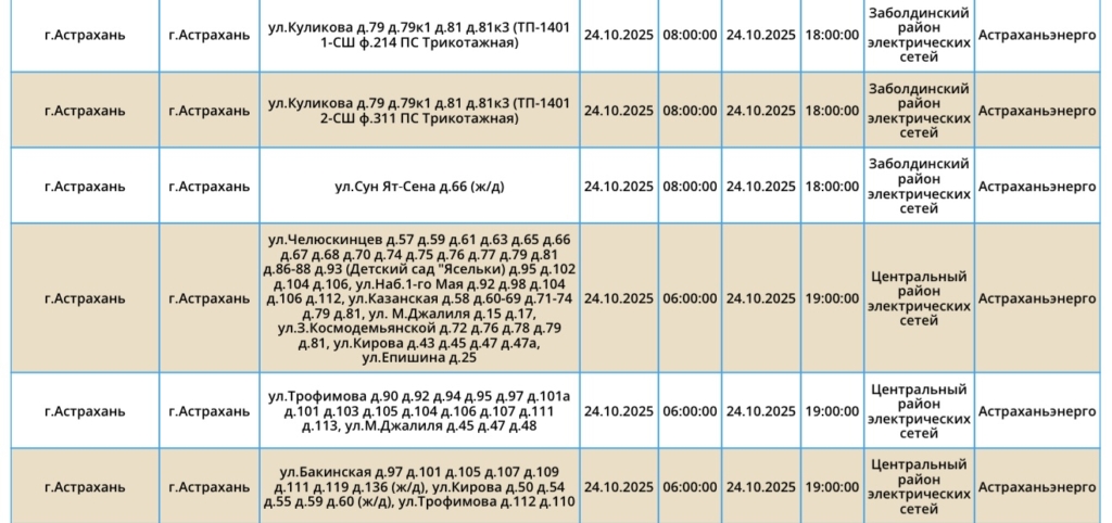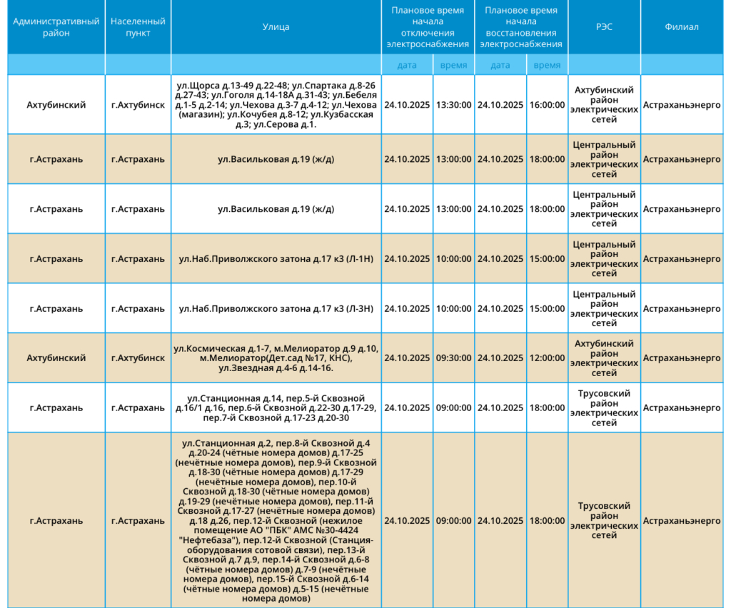 24 октября отключат свет в Астрахани и Ахтубинске