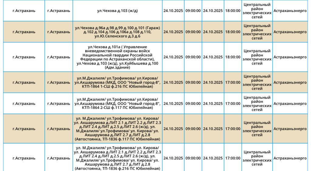Самые ранние отключения начнутся в 08:00 и продлятся около 10 часов. Свет отключат как в самом областном центре, так и в Ахтубинском районе. Подробнее со списком адресов можно ознакомиться в галерее ниже: