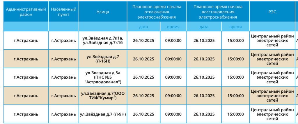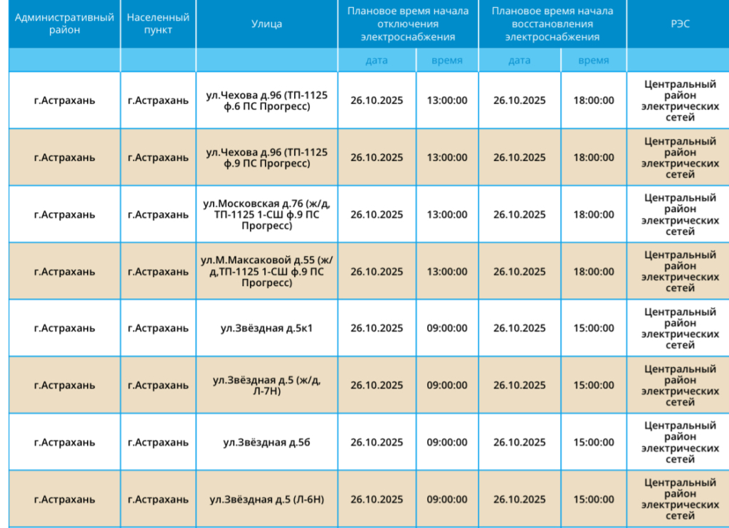 Отключения пройдут в городе Астрахань. Стартуют работы в 09:00, а вернется ресурс в дома и квартиры астраханцев только к 15:00 или 18:00. Без света останутся жилые дома и ПНС. Подробности в галерее ниже: