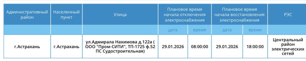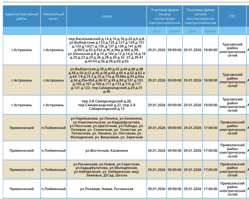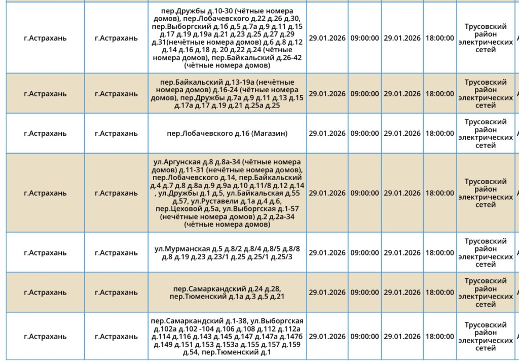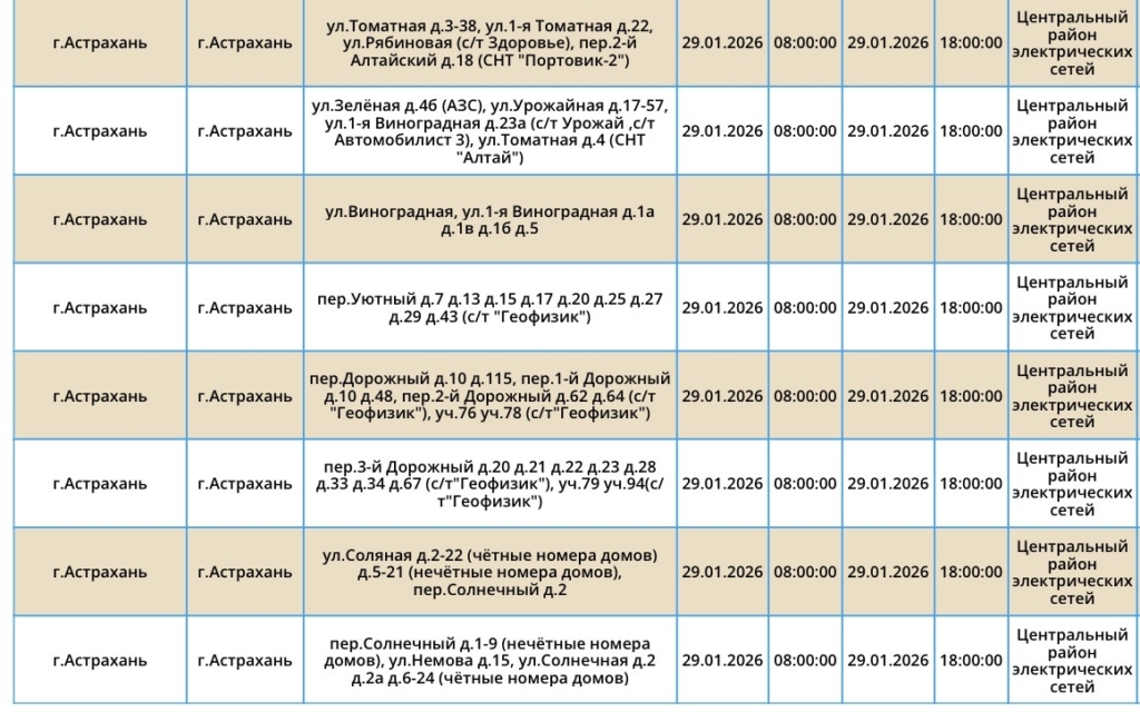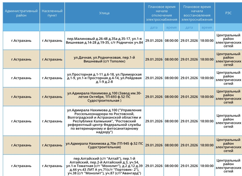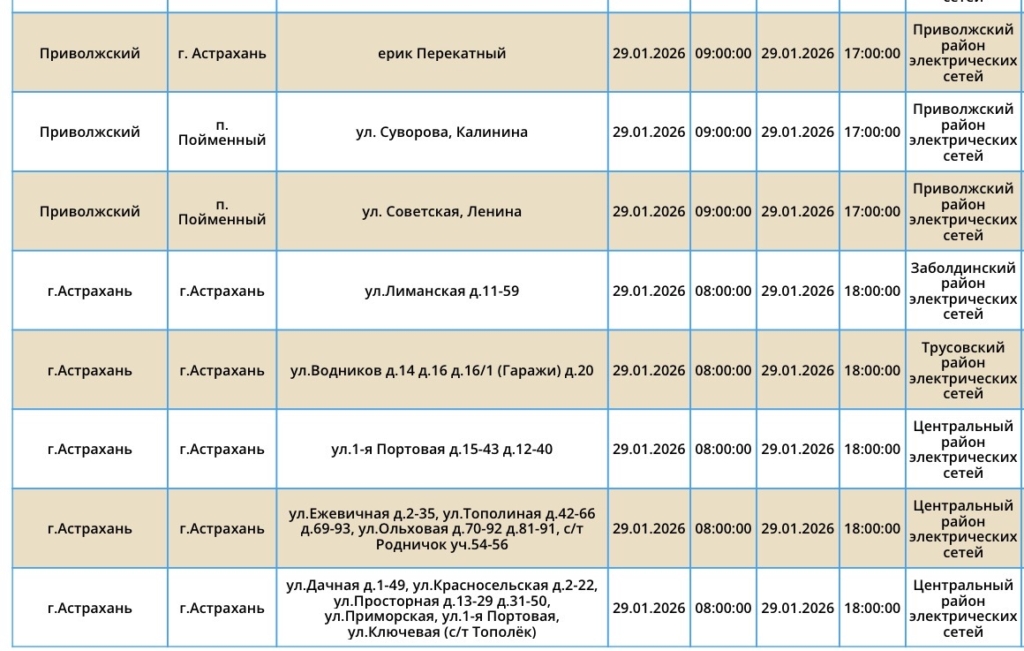 Отключения затронут Приволжский и Ахтубинский районы области, а также город Астрахань. Электричества не будет в жилых домах, садовых товариществах, детских садах, школах, магазинах, отделениях почты. Полный список адресов представлен ниже: