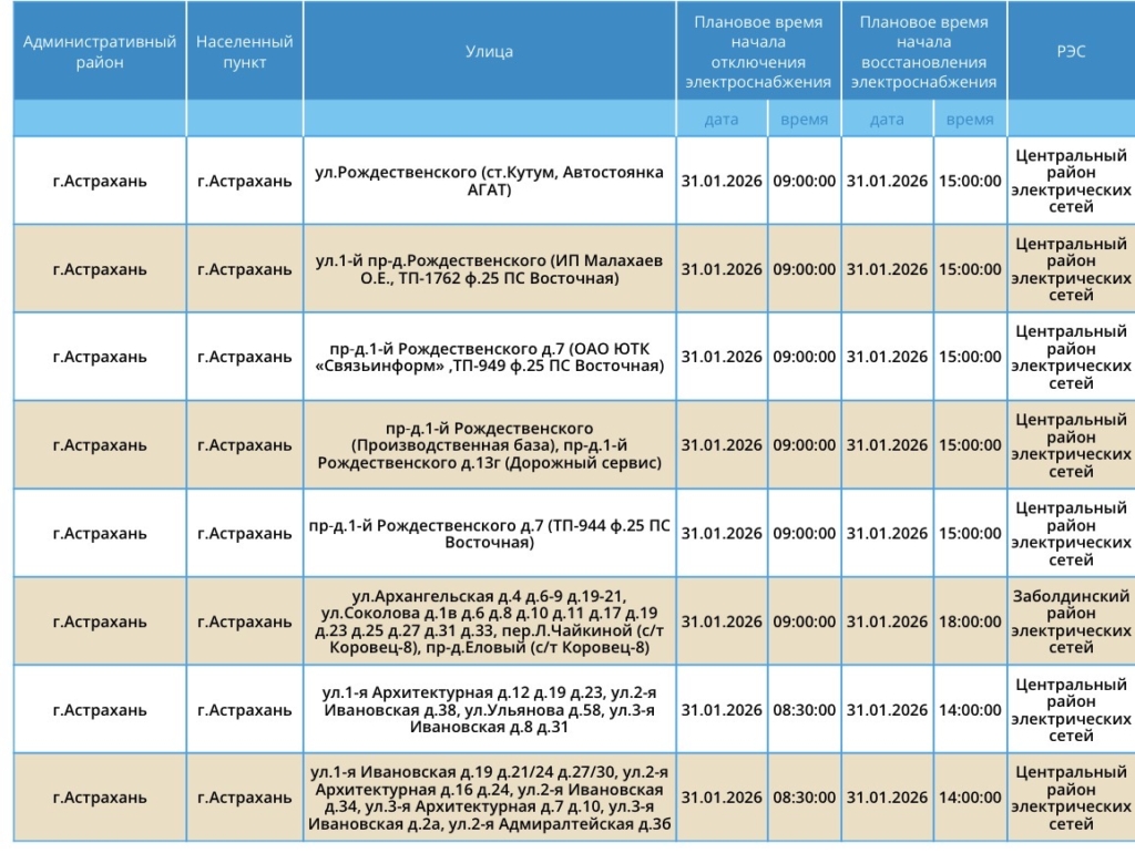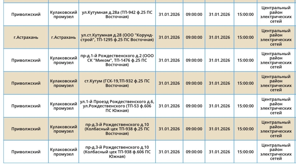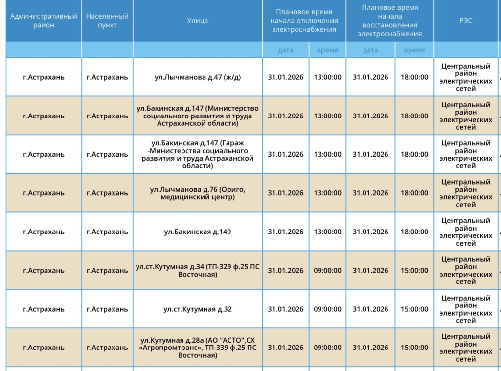 31 января Астрахань и Приволжский район области останутся без света