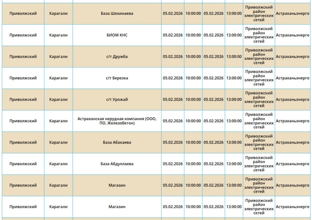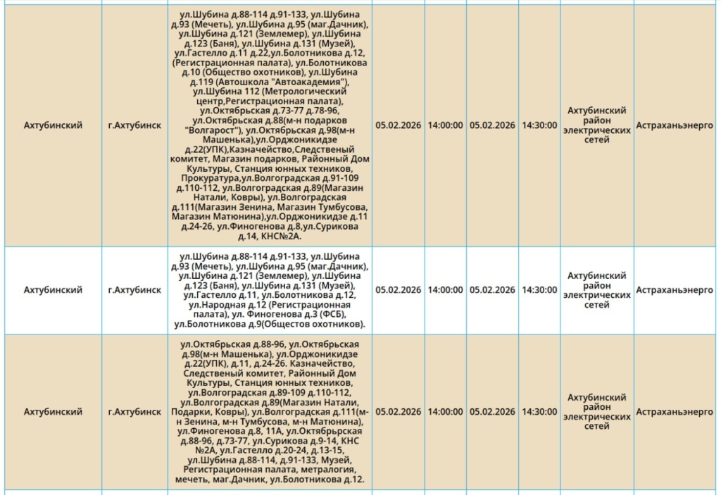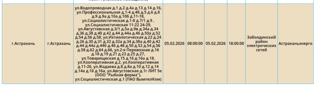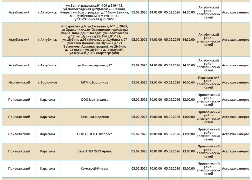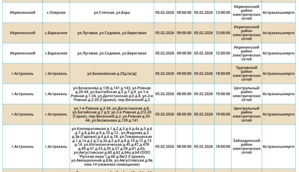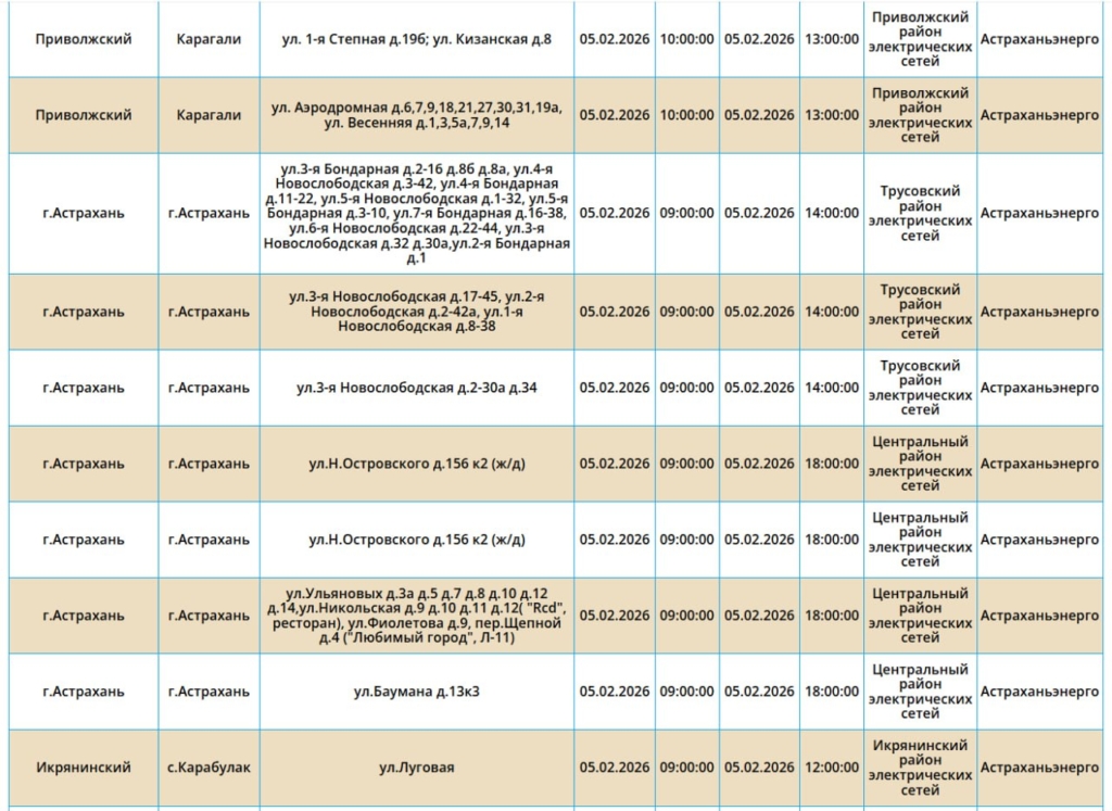 Так, света не будет на некоторых улицах Астрахани, а также Ахтубинского, Приволжского и Икрянинского районов. Без электричества останутся жилые дома, административные здания, образовательные и медицинские учреждения. Самые ранние отключения начнутся в 08:00. Полный список адресов смотрите ниже: