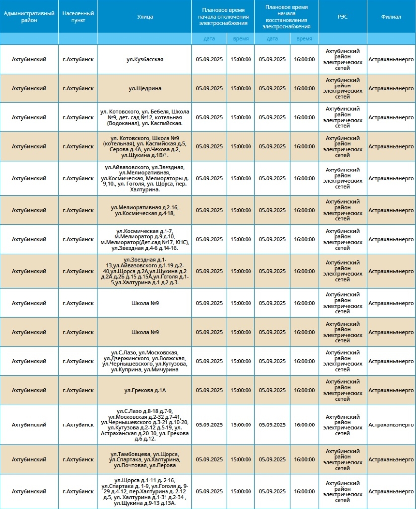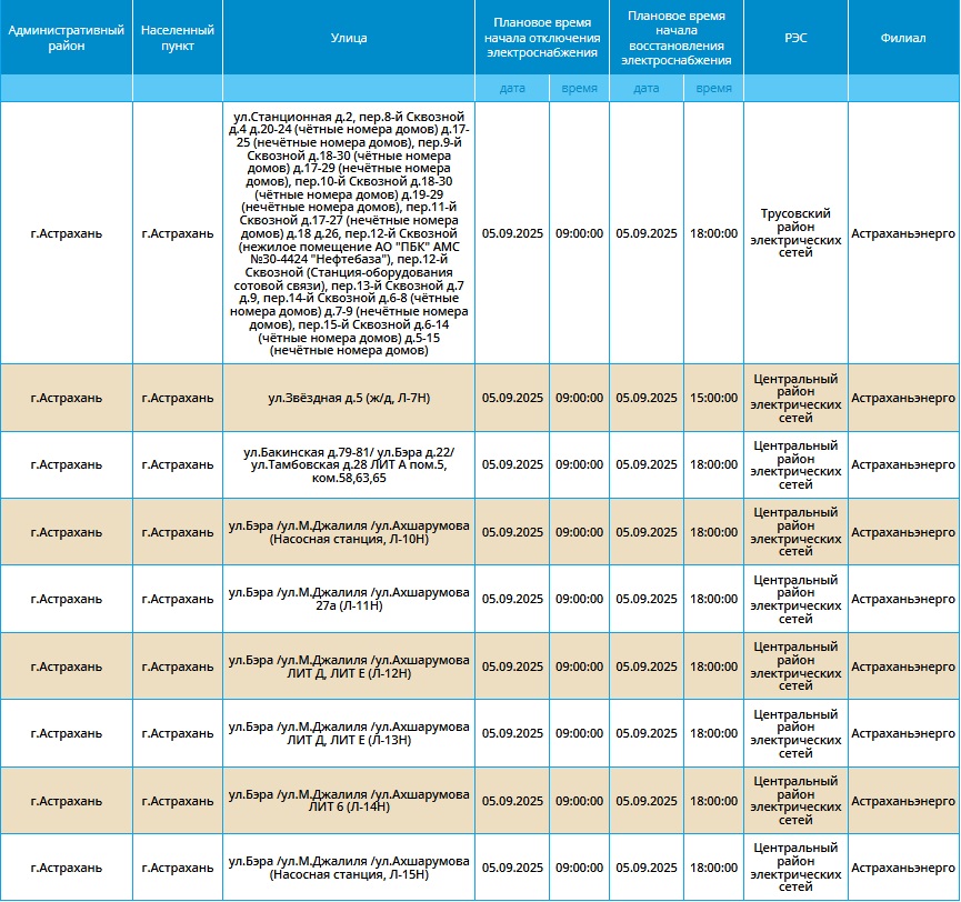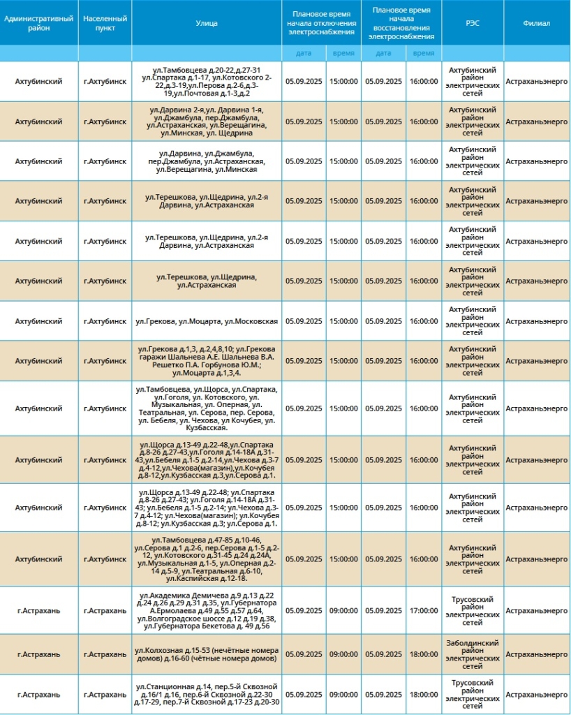 Завтра, 5 сентября, в Астрахани и по области вновь пройдут плановые отключения электроэнергии. Об этом сообщает ПАО «Россети Юг».