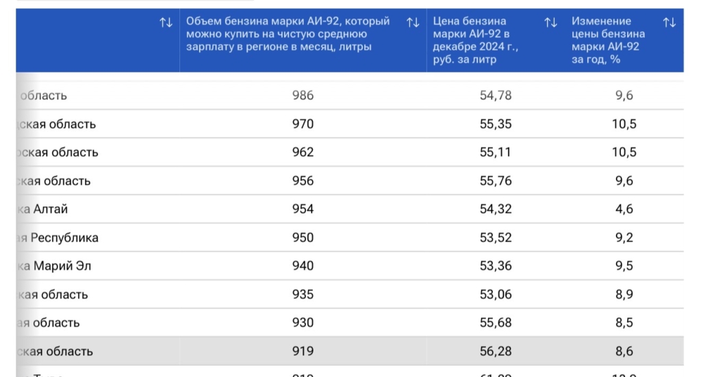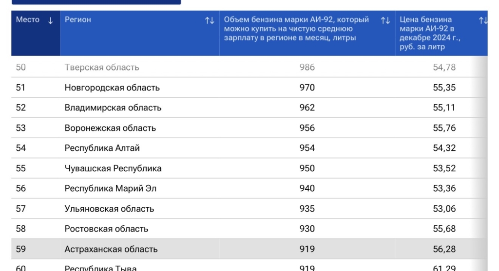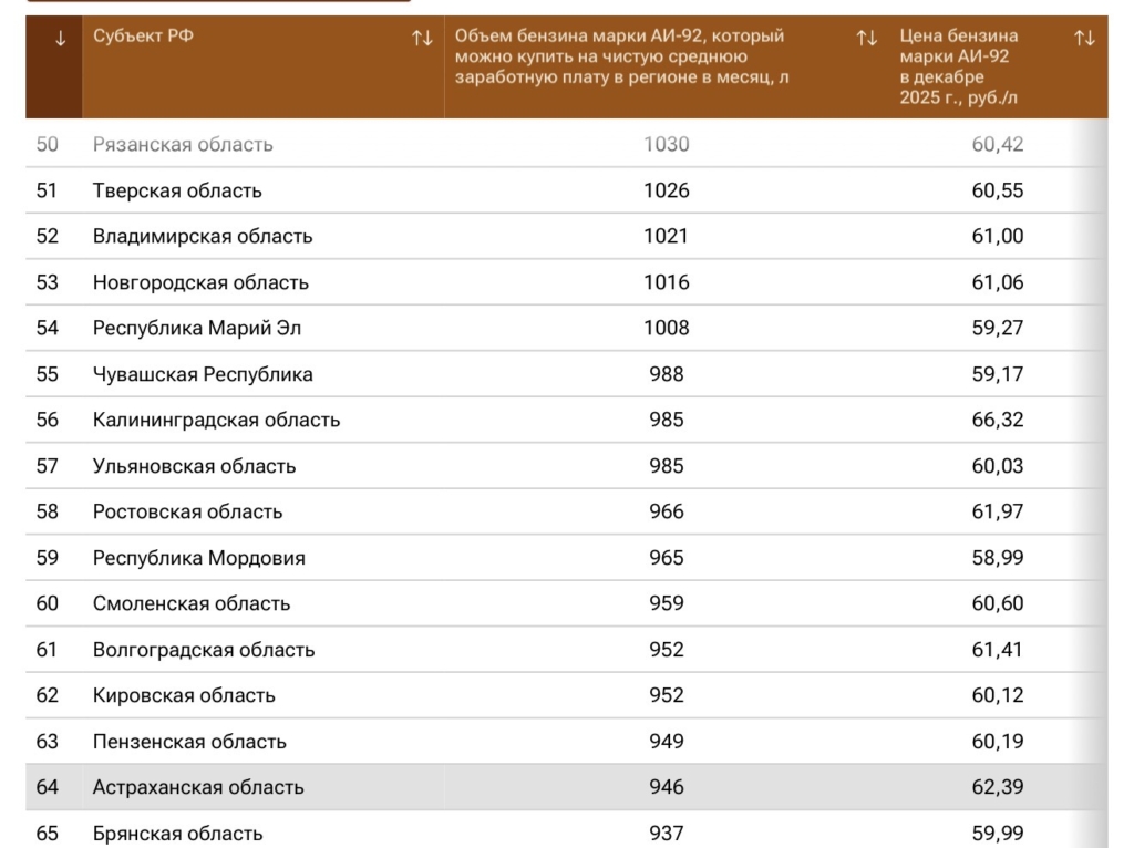 В прошлом году ситуация была следующая. Астраханская область занимала 59 место, купить местные жители могли 919 литров бензина при стоимости литра АИ-92 – 56,28 рубля. С 2024 по 2025 годы цена выросла на 8,6%.