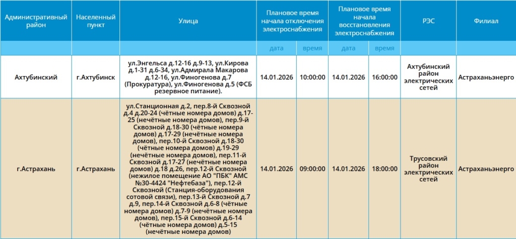 Завтра временно света не будет в жилых домах и административных зданиях, которые расположены по некоторым адресам в Астрахани, а также в Ахтубинском районе. Полный список адресов на фото ниже: