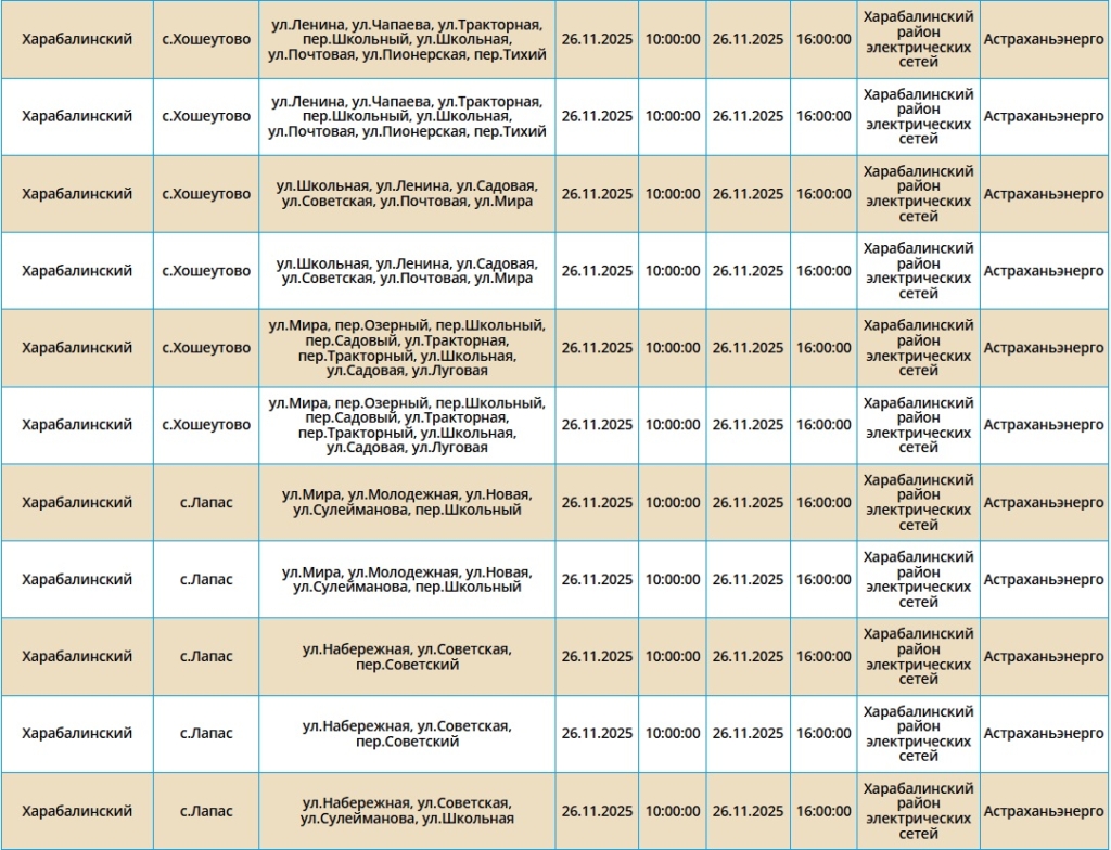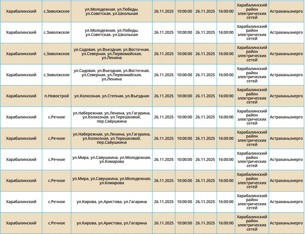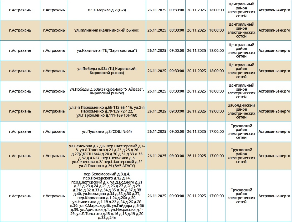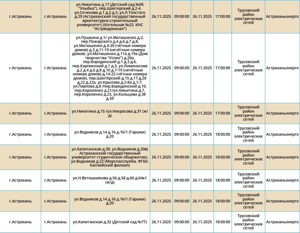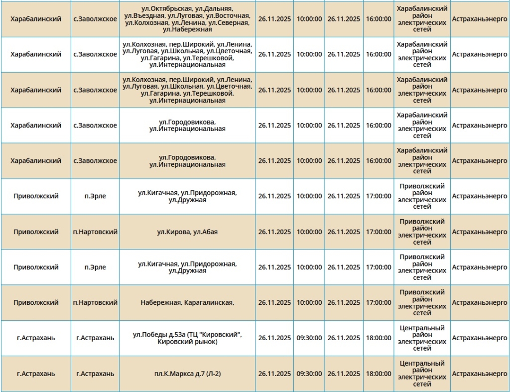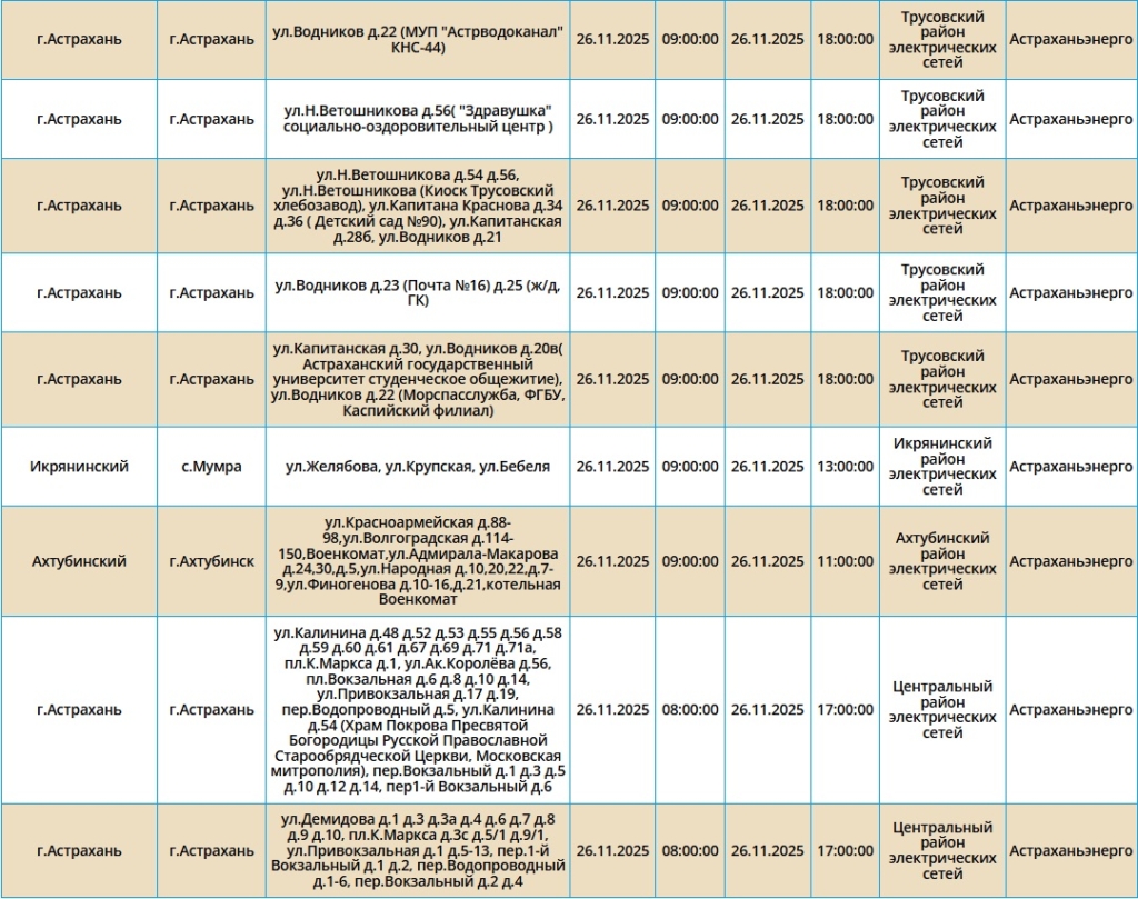 Отключения пройдут как в самом городе Астрахань, так и в Ахтубинском, Харабалинском и Икрянинском районах. Самые ранние отключения начнутся в 08:00. Подробнее со списком адресов можно ознакомиться в галерее ниже:
