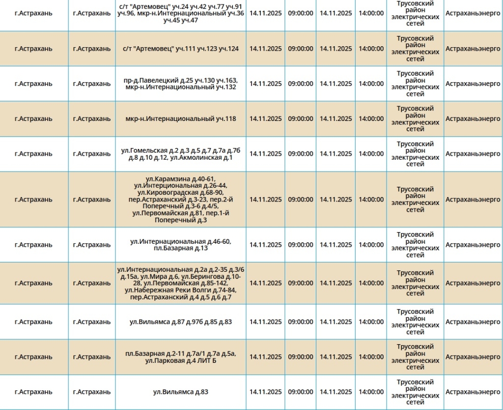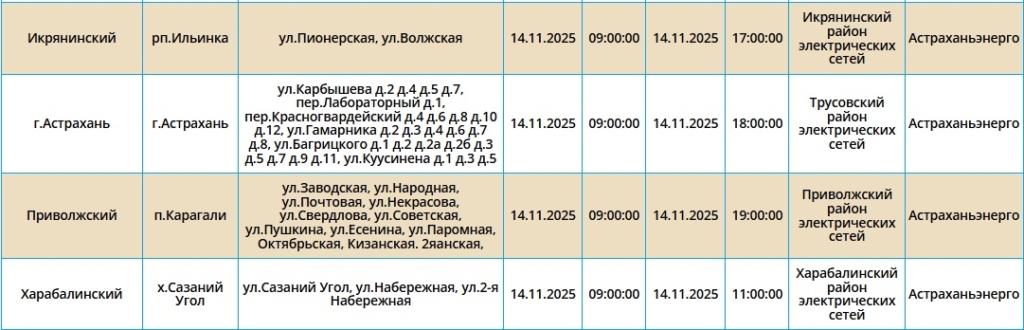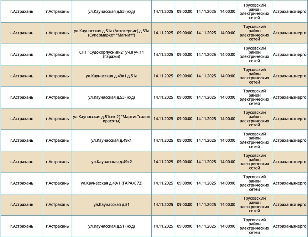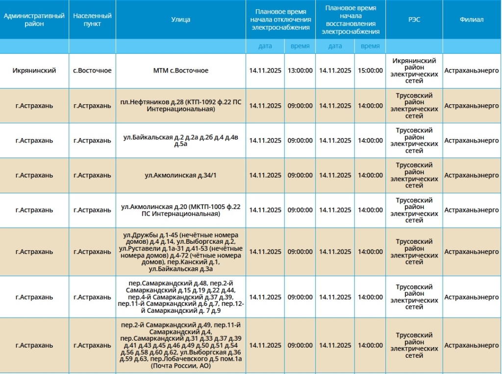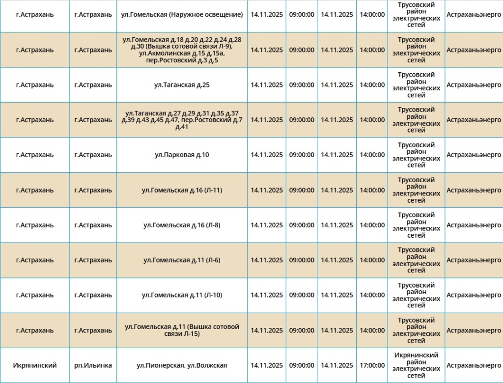 Завтра, 14 ноября, в Астраханской области пройдут очередные массовые отключения электроэнергии. Это необходимо для проведения плановых ремонтных работ на электросетях, сообщают сотрудники ПАО «Россети Юг».