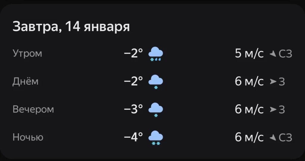 14 января в Астрахани ожидается температура воздуха в пределах минус двух градусов днем и минус четырех ночью. С утра возможен мокрый снег, который к ночи может перестать иметь примесь дождя. К завершению дня астраханцам синоптики обещают полноценный снегопад. Ветер западный, 6 м/с.