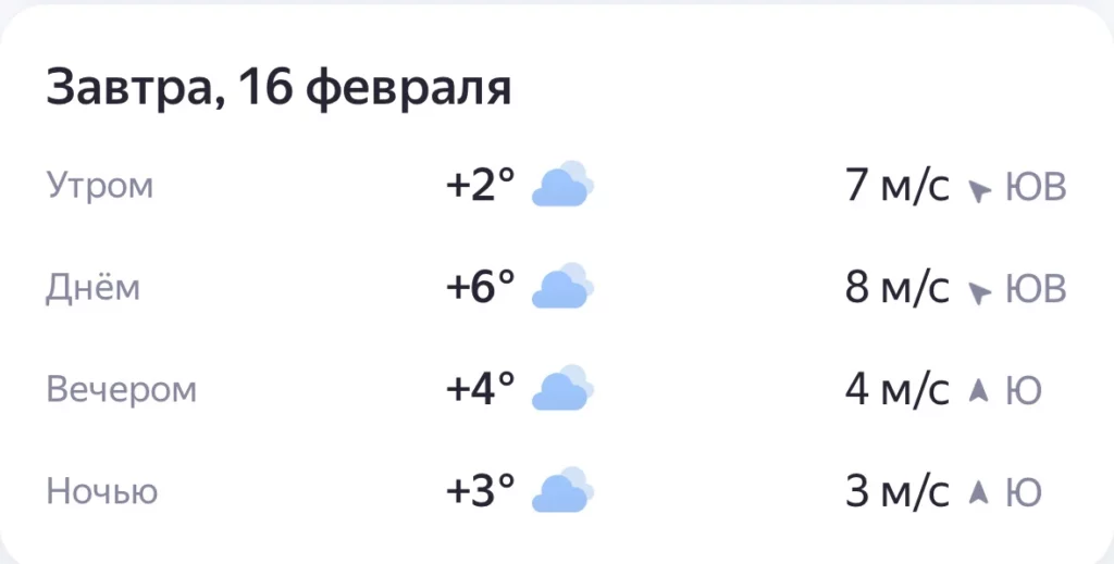 16 февраля в Астрахани ожидается облачная погода без осадков. Температура воздуха днем составит 6 градусов тепла, а ночью следует ожидать три градуса выше ноля. Ветер юго-восточный, 8 м/с.