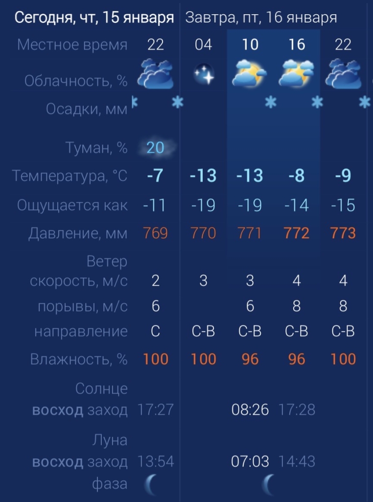 Утром температура в городе составит ‑13 градусов. Днем потеплеет до ‑8. К вечеру температура упадет до ‑9 градусов. Астраханцев ждет северо-восточный ветер со скоростью 4 ‑8 м/с. Атмосферное давление составит 772 мм рт. ст. Влажность воздуха выше нормы.
