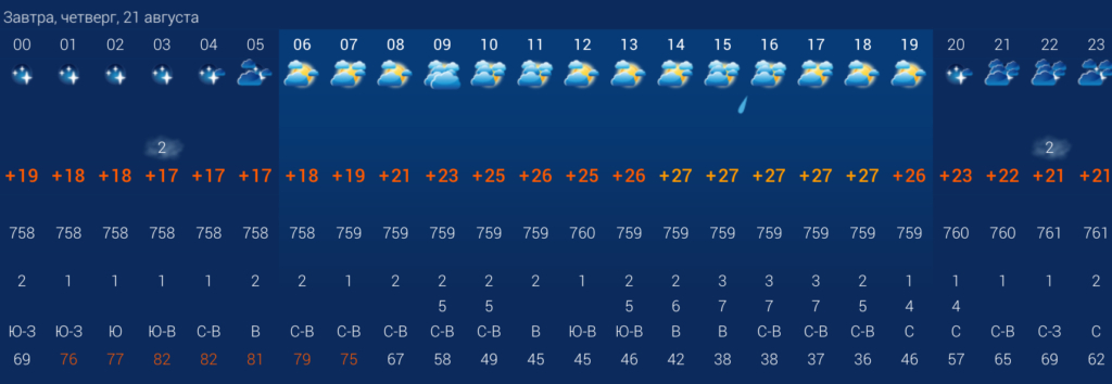 Такая погода – именно то, что нужно после затяжной жары, которая была в июле. Днем температура воздуха в городе будет в пределах +21…+27 градусов, а ночью понизится до +21.