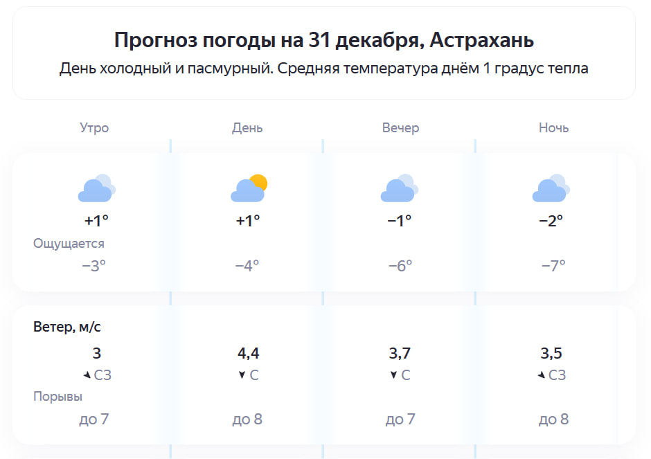 Астраханцы проснутся при температуре +1 градус (который по ощущениям, конечно же, как честные ‑3 градуса), день особо не изменит расклад: погода по-астрахански будет упорно держать градус на уровне слабого оптимизма – +1 градус, а к вечеру и ночью температура опустится до ‑1 градуса и ‑2 градуса соответственно. Самое время подумать: чем греться – мандаринами или еще теплыми носками из новогоднего подарочного набора?