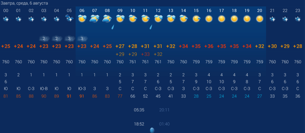 В первой половине дня в городе будет небольшая облачность и дождь в 09:00 и 12:00. Во второй половине дня погода кардинально изменится – будет солнечно. Влажность воздуха составит 44%. По данным погодных агрегаторов, весь день будет дуть ветер с порывами до 4 м/с.