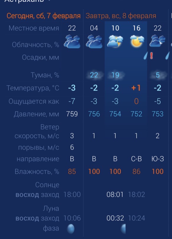 Утром температура в городе составит ‑2 градуса. Днем потеплеет до +1. К вечеру температура вновь упадет до ‑2 градусов. Астраханцев ждет северо-восточный ветер со скоростью 1 – 2 м/с. Атмосферное давление составит 752 мм рт. ст. Влажность воздуха выше нормы.