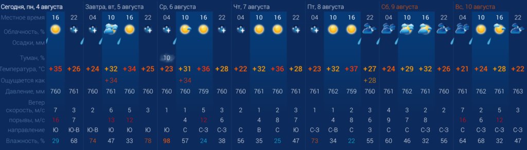 Но жителей города ждут и средние температурные значения. В понедельник будет +35 градусов, во вторник +34 градуса, в среду и четверг ожидается +36 градусов, в пятницу будет +37. На выходных температура будет колебаться от +28 до +32 градусов. Так что, для отдыха на воде лучше выбрать будние дни.