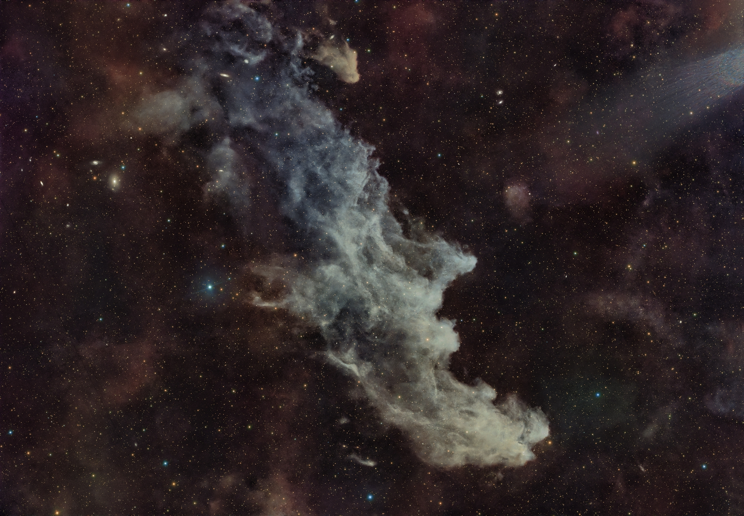 Эта туманность – IC 2118, больше известная как «Голова Ведьмы». Фотографию сделали с помощью малого широкоугольного телескопа-рефрактора системы Пецваля Askar 71F. Несмотря на компактные размеры инструмента, он позволяет получать детальные изображения протяженных объектов – именно таких, как эта туманность.