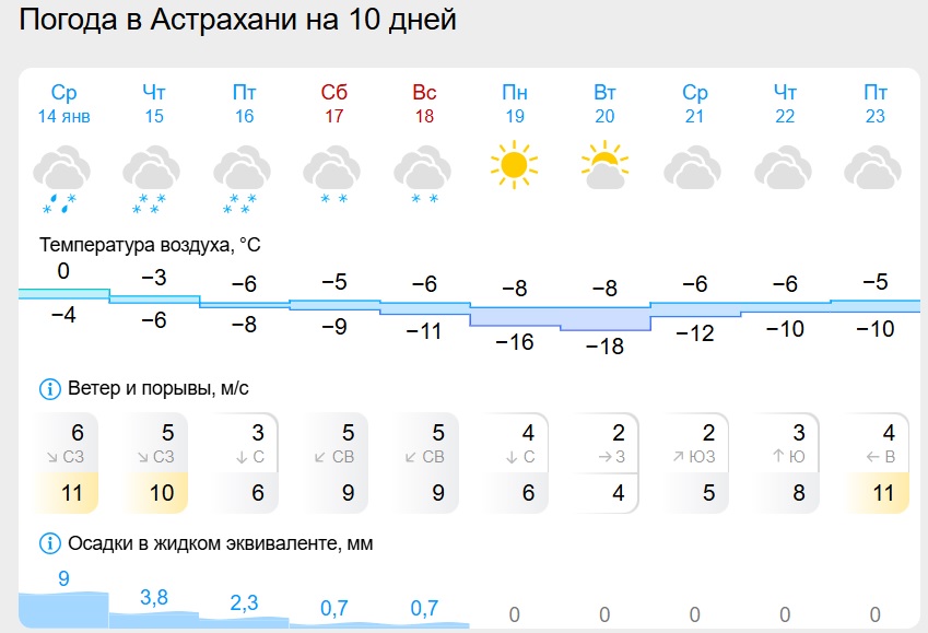 При этом сегодняшний снегопад – лишь вступление. Самыми холодными днями, по прогнозам, станут воскресенье, 18 января, и понедельник, 19 января. В эти дни температура днем может опуститься до ‑9 градусов, а ночью – до ‑14 градусов. Для Астрахани такие значения уже близки к настоящей зимней классике.