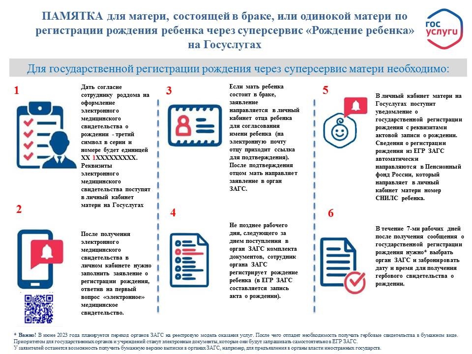 Регистрация рождения ребенка с помощью суперсервиса «Рождение ребенка» на Госуслугах осуществляется в несколько простых этапов. Для начала нужно дать согласие сотруднику роддома на оформление электронного медицинского свидетельства о рождении. Реквизиты документа поступят в личный кабинет матери на Госуслугах. После получения на портале требуется заполнить заявление о регистрации рождения, отметив в первом пункте «электронное» медицинское свидетельство.