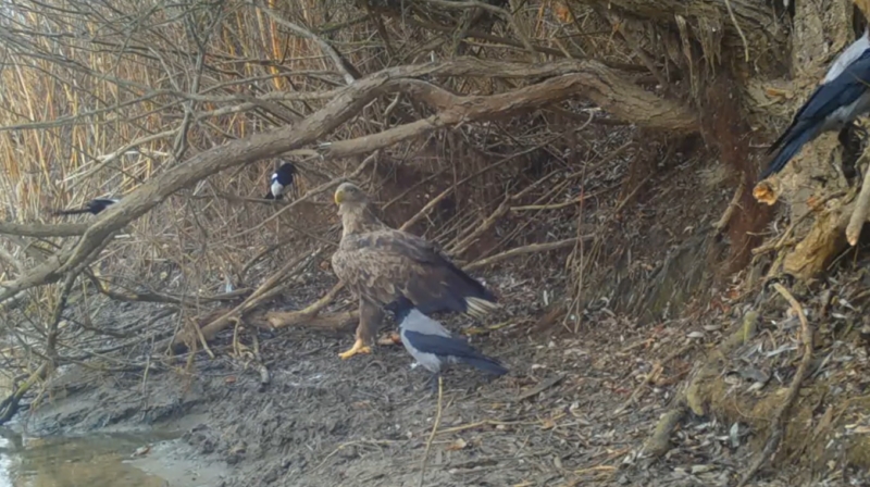 Кому именно принадлежал улов изначально, определить не удалось. Однако в какой-то момент добыча оказалась в когтях у орлана-белохвоста. Серые вороны и сороки попытались отобрать рыбу у хищной птицы привычной для них хитростью, но перед этим они еще и между собой успели шумно «разделить» чужое пропитание – безуспешно.