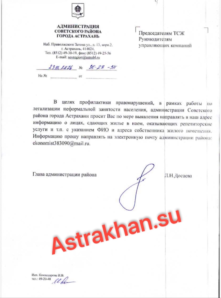 В распоряжении редакции Астрахань.ру оказался неоднозначный документ, который администрация Советского района города направила в местные ТСЖ и УК. Чиновники предложили «управляшкам» и самим астраханцам сообщать информацию о лицах, сдающих жилье в наем, оказывающих репетиторские услуги и прочее. Необходимо такое «стукачество» для профилактики правонарушений, в рамках работы легализации неформальной занятости населения. «Попахивает» Советским Союзом и былым доносами. Разбираемся в легальности таких «предложений» в нашем новом материале.