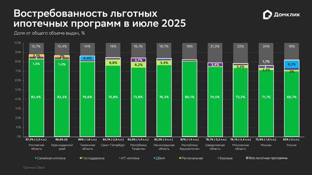 Среди регионов-лидеров по объёму выдач (представлены на инфографике) высокая доля выдач по Семейной ипотеке отмечается в Краснодарском крае (82,5%) и Ростовской области (82,4%).
