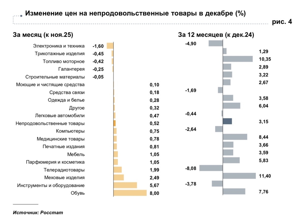 Заметнее всего в декабре выросли цены на непродовольственные товары. Так, в цене выросла теплая обувь. Это позволило продавцам перенести в цены возросшие расходы на логистику, оплату труда и аренду помещений. Подорожали оборудование, мебель и инструменты. При этом, снизились цены на электронику и бытовую химию. Магазины в преддверии новогодних праздников объявляли скидки на стиральные машины, пылесосы.