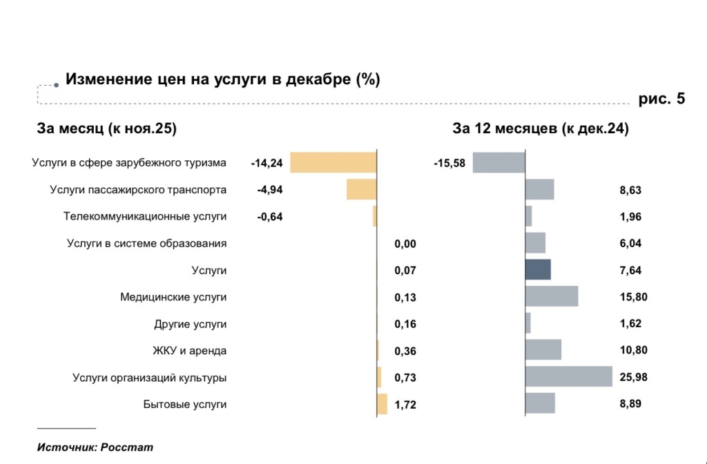 Также в декабре выросли цены на бытовые услуги. Это связано с ростом издержек поставщиков на закупку сырья и инструментов, обслуживание оборудования, аренду помещений и оплату труда. Подорожало посещение кинотеатров из-за роста расходов на зарплату и аренду помещений. Но снизились цены на услуги в сфере зарубежного туризма. Также, в связи с окончанием сезона высокого спроса, наблюдалось снижение цен на поездки в Египет, Турцию, ОАЭ.