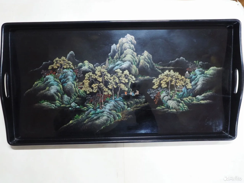 Еще одна находка – чайный сервиз середины 20 века. Он украшен лаковой росписью. Это сложная техника: поверхность покрывают несколькими слоями лака, затем полируют и вручную наносят рисунок. Каждый предмет расписывается отдельно, поэтому узоры не повторяются. Даже со следами времени такой сервиз выглядит атмосферно и создает ощущение домашнего уюта.