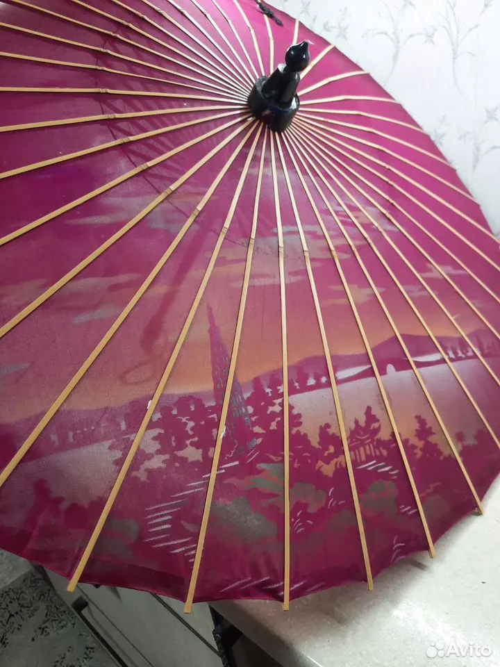 Замыкает подборку китайский зонтик 1950‑х годов из шелка и бамбука. Такие парасоли использовали на праздниках, в театральных постановках и уличных церемониях. Это скорее декоративная вещь – легкая, изящная и очень фотогеничная. Продавец предлагает оформить покупку с доставкой.
