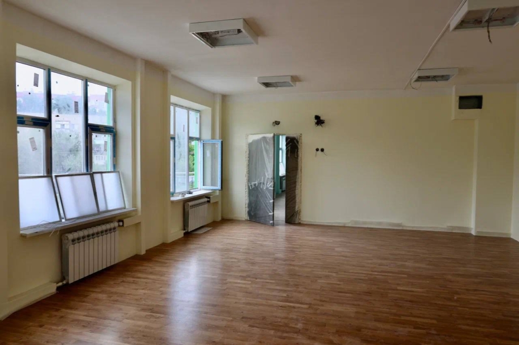 Здание будет трехэтажным. Здесь проведены тепловые сети и сети водоотведения, завершен монтаж вентиляции и покраска фасада и отделочные работы в помещениях. На территории установлено уличное освещение, благоустраивается территория.