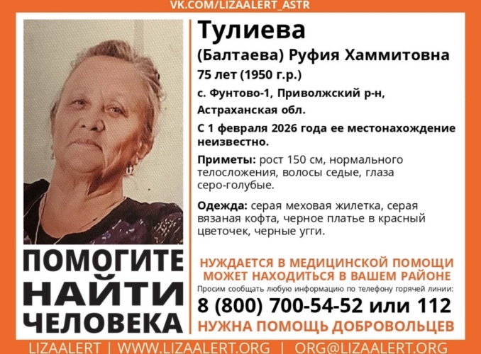 По данным волонтеров поискового отряда «ЛизаАлерт», в Астраханской области пропала Тулиева Руфия Хаммитовна. Женщине 75 лет.
