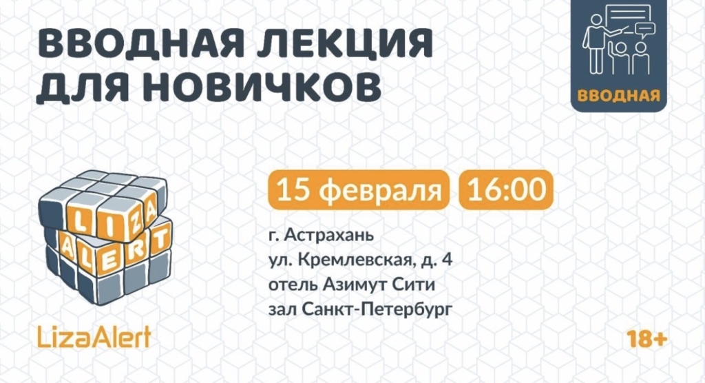 Волонтеры «ЛизаАлерт» приглашают всех желающих на вводную лекцию для новичков. Там астраханцы смогут узнать о работе отряда и о том, как стать частью команды. В отряде функционирует 24 направления. Опыт не имеет значения, главное – желание. Состоится мероприятие 15 февраля в 16:00 на улице Кремлевская, 4. Регистрация здесь. Задать вопросы можно по номеру: 8(988)177‐46‐20.