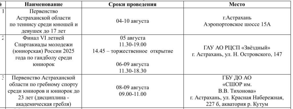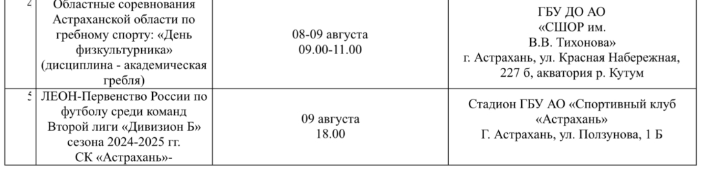 В Министерстве физической культуры и спорта Астраханской области опубликовали план-график спортивных мероприятий, которые пройдут в регионе с 4 по 10 августа.