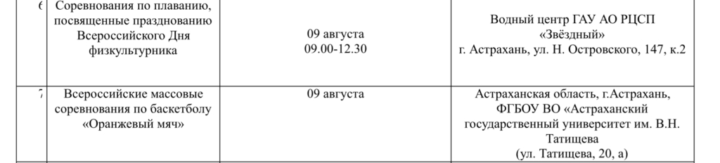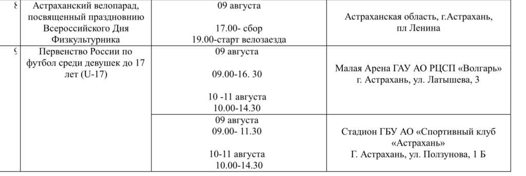 Местных жителей и гостей региона ждут соревнования по плаванию, первенство России по футболу, астраханский велопарад, всероссийские массовые соревнования по баскетболу и многое другое. Подробности ниже: