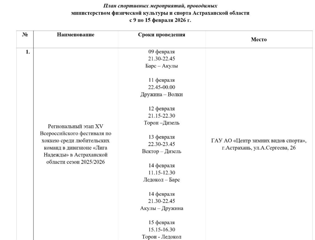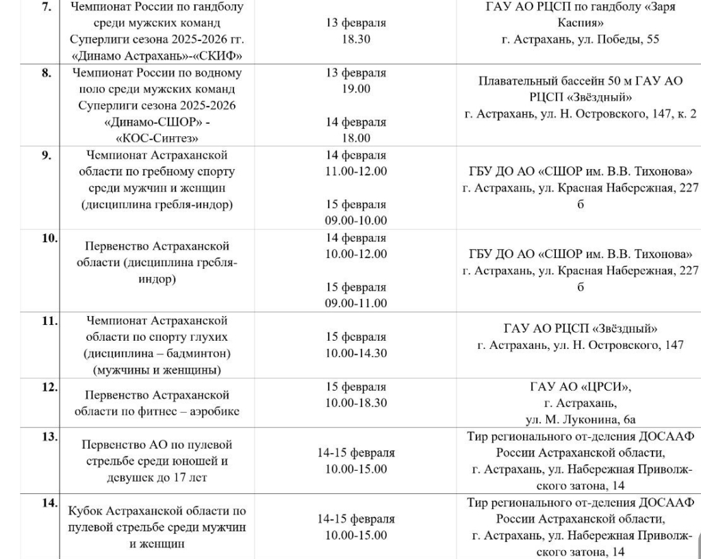 В Министерстве физической культуры и спорта Астраханской области сообщили о спортивных мероприятиях, которые пройдут в городе на неделе с 9 по 15 февраля.